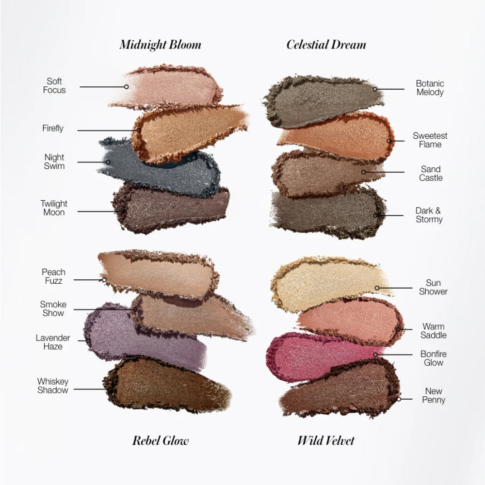 sun shower: mica / coco-caprylate/caprate / cetearyl ethylhexanoate / glycerin / sorbitan oleate decylglucoside crosspolymer / hydrolyzed rice protein / water/aqua/eau / sodium isostearate / squalane (vegetable) / caprylyl glycol / ethylhexylglycerin / 1,2-hexanediol / pentylene glycol / gellan gum / calcium chloride / sodium chloride / pentaerythrityl tetra-di- t-butyl hydroxyhydrocinnamate / zinc stearate / lauroyl lysine / tin oxide / *simmondsia chinensis (jojoba) seed oil / sodium citrate / xanthan gum / **mauritia flexuosa (buriti) fruit oil / rosmarinus officinalis (rosemary) leaf extract / helianthus annuus (sunflower) seed oil / tocopherol (non gmo) / titanium dioxide (ci 77891) / iron oxides (ci 77491). warm saddle / bonfire glow / new penny: mica / coco-caprylate/caprate / cetearyl ethylhexanoate / glycerin / sorbitan oleate decylglucoside crosspolymer / hydrolyzed rice protein / water/aqua/eau / sodium isostearate / squalane (vegetable) / caprylyl glycol / ethylhexylglycerin / 1,2-hexanediol / pentylene glycol / gellan gum / calcium chloride / sodium chloride / pentaerythrityl tetra-di-t-butyl hydroxyhydrocinnamate / zinc stearate / lauroyl lysine / *simmondsia chinensis (jojoba) seed oil / sodium citrate / xanthan gum / **mauritia flexuosa (buriti) fruit oil / rosmarinus officinalis (rosemary) leaf extract / helianthus annuus (sunflower) seed oil / tocopherol (non gmo) / titanium dioxide (ci 77891) / iron oxides (ci 77491 / ci 77492 / ci 77499). rebel glow peach fuzz: mica / coco-caprylate/caprate / cetearyl ethylhexanoate / glycerin / sorbitan oleate decylglucoside crosspolymer / hydrolyzed rice protein / water/aqua/eau / sodium isostearate / squalane (vegetable) / caprylyl glycol / ethylhexylglycerin / 1,2-hexanediol / pentylene glycol / gellan gum / calcium chloride / sodium chloride / pentaerythrityl tetra-di- t-butyl hydroxyhydrocinnamate / zinc stearate / lauroyl lysine / tin oxide / *simmondsia chinensis (jojoba) seed oil / sodium citrate / xanthan gum / **mauritia flexuosa (buriti) fruit oil / rosmarinus officinalis (rosemary) leaf extract / helianthus annuus (sunflower) seed oil / tocopherol (non gmo) / titanium dioxide (ci 77891) / iron oxides (ci 77491 / ci 77492 / ci 77499). smoke show / whiskey shadow: mica / coco-caprylate/caprate / cetearyl ethylhexanoate / glycerin / sorbitan oleate decylglucoside crosspolymer / hydrolyzed rice protein / water/aqua/eau / sodium isostearate / squalane (vegetable) / caprylyl glycol / ethylhexylglycerin / 1,2-hexanediol / pentylene glycol / gellan gum / calcium chloride / sodium chloride / pentaerythrityl tetra-di t-butyl hydroxyhydrocinnamate / zinc stearate / lauroyl lysine / *simmondsia chinensis (jojoba) seed oil / sodium citrate / xanthan gum / **mauritia flexuosa (buriti) fruit oil / rosmarinus officinalis (rosemary) leaf extract / helianthus annuus (sunflower) seed oil / tocopherol (non gmo) / titanium dioxide (ci 77891) / iron oxides (ci 77491 / ci 77492 / ci 77499). lavender haze: mica / coco-caprylate/caprate / cetearyl ethylhexanoate / glycerin / sorbitan oleate decylglucoside crosspolymer / hydrolyzed rice protein / water/aqua/eau / sodium isostearate / squalane (vegetable) / caprylyl glycol / ethylhexylglycerin / 1,2-hexanediol / pentylene glycol / gellan gum / calcium chloride / sodium chloride / pentaerythrityl tetra-di-t-butyl hydroxyhydrocinnamate / zinc stearate / lauroyl lysine / silica / *simmondsia chinensis (jojoba) seed oil / sodium citrate / xanthan gum / **mauritia flexuosa (buriti) fruit oil / kaolin / rosmarinus officinalis (rosemary) leaf extract / helianthus annuus (sunflower) seed oil / tocopherol (non gmo) / titanium dioxide (ci 77891) / iron oxides (ci 77491 / ci 77492 / ci 77499) / manganese violet (ci 77742) / ferric ferrocyanide (ci 77510) / ultramarines (ci 77007). midnight bloom soft focus / firefly / twilight moon: mica / coco-caprylate/caprate / cetearyl ethylhexanoate / glycerin / sorbitan oleate decylglucoside crosspolymer / hydrolyzed rice protein / water/aqua/eau / sodium isostearate / squalane (vegetable) / caprylyl glycol / ethylhexylglycerin / 1,2-hexanediol / pentylene glycol / gellan gum / calcium chloride / sodium chloride / pentaerythrityl tetra-di-t-butyl hydroxyhydrocinnamate / zinc stearate / lauroyl lysine / *simmondsia chinensis (jojoba) seed oil / sodium citrate / xanthan gum / **mauritia flexuosa (buriti) fruit oil / rosmarinus officinalis (rosemary) leaf extract / helianthus annuus (sunflower) seed oil / tocopherol (non gmo) / titanium dioxide (ci 77891) / iron oxides (ci 77491 / ci 77492 / ci 77499). night swim: mica / coco-caprylate/caprate / cetearyl ethylhexanoate / glycerin / sorbitan oleate decylglucoside crosspolymer / hydrolyzed rice protein / water/aqua/eau / sodium isostearate / squalane (vegetable) / caprylyl glycol / ethylhexylglycerin / 1,2-hexanediol / pentylene glycol / silica / gellan gum / calcium chloride / sodium chloride / pentaerythrityl tetra-di-t-butyl hydroxyhydrocinnamate / zinc stearate / lauroyl lysine / kaolin / *simmondsia chinensis (jojoba) seed oil / sodium citrate / xanthan gum / **mauritia flexuosa (buriti) fruit oil / rosmarinus officinalis (rosemary) leaf extract / helianthus annuus (sunflower) seed oil / tocopherol (non gmo) / titanium dioxide (ci 77891) / iron oxides (ci 77491 / ci 77492 / ci 77499) / ultramarines (ci 77007). celestial dream botanic melody (satin): mica / coco-caprylate/caprate / cetearyl ethylhexanoate / glycerin / sorbitan oleate decylglucoside crosspolymer / hydrolyzed rice protein / water/aqua/eau / sodium isostearate / squalane (vegetable) / caprylyl glycol / ethylhexylglycerin / 1,2-hexanediol / pentylene glycol / gellan gum / calcium chloride / sodium chloride / pentaerythrityl tetra-di-t-butyl hydroxyhydrocinnamate / zinc stearate / lauroyl lysine / *simmondsia chinensis (jojoba) seed oil / sodium citrate / xanthan gum / **mauritia flexuosa (buriti) fruit oil / rosmarinus officinalis (rosemary) leaf extract / h